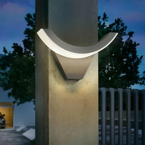 Mit der LED-Außenwandleuchte machen Sie Ihren Hauseingang und alle anderen Hauswände zu einer Präsentationsfläche für ein modernes Beleuchtungskonzept. Das Design der Außenwandleuchte fokussiert sich vollständig auf das Leuchtenelement, das als schwungvoller Bogen horizontal an einer dezenten Wandaufhängung angebracht ist. Dabei erstreckt sich die Leuchtfläche über die Unterseite des Bogens und verteilt dort hinter einer Kunststoffscheibe 96 LEDs. Deren warmweißes Licht wird durch die Mattierung der Scheibe gleichmäßig verteilt und ohne zu blenden nach unten geleitet.