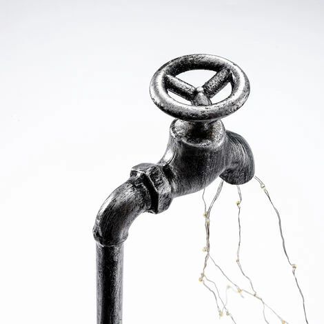 Ganz schlicht und doch so bezaubernd ist diese Solardekoleuchte in Form eines Gartenwasserhahnes: An einem Stahlrohr im Vintage-Style ist ein antik anmutender Wasserhahn angebracht, aus dem fünf LED-Lichterfäden wie ein Wasserstrahl nach unten fließen und ihr warmweißes Licht über den Boden träufeln.