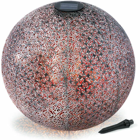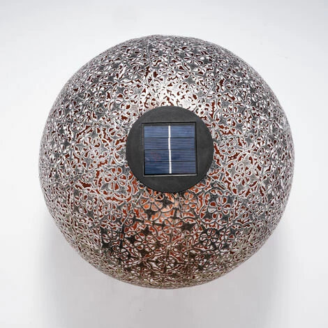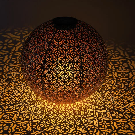Die Solarkugel Basima ist der strahlende Mittelpunkt eines bezaubernden Farb- und Schattenspiels, das uns an die Märchen aus 1001 Nacht denken lässt: Das hochwertige Stahlblech, aus dem die große Kugel gefertigt ist, wird von einem filigranen Muster aus symmetrischen Blütenformen durchbrochen, durch das sich das bernsteinfarbene Licht der LED als Muster über den Boden ergießt. Die warm-orangene Farbgebung wird noch durch einen sanften Terrakotta-Ton verstärkt, mit dem die Innenseite der Solarkugel versehen ist.
