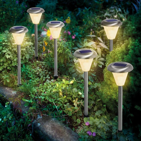 Anders als eine antike Straßenlaterne werden die Solar-Steckleuchten selbstverständlich nicht mit Gas betrieben, sondern gewinnen ihre Energie über das Solarmodul direkt aus der Sonne, mit der sie schließlich bei einsetzender Dämmerung das warmweiße Licht einer leuchtstarken und gleichzeitig energiesparenden Osram-LED aktivieren. Für ein edles Lichtarrangement ordnen Sie die sechs Solar-Steckleuchten als eine Gruppe an, für einzelne Lichtakzente verteilen Sie sie einfach unabhängig voneinander in Beeten, auf dem Rasen oder in Balkonkästen.