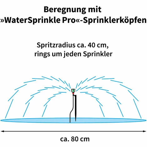 Mit seinen sechs rotierenden Sprinklern ist das Solar-Bewässerungsset »WaterSprinkle« ideal, um etwa große Beete oder lange Gemüsereihen im heimischen Garten flächig zu bewässern. Vom Wasserdruck in Rotation versetzt, benetzt jeder Beregnungskopf von seinem Erdspieß aus einen Radius von bis zu 80 cm. Die mit Wasser versorgte Gesamtfläche beträgt somit rund fünf Ouadratmeter!