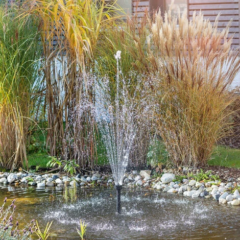 Die Pumpe kann über ein geeignetes Solarmodul, einem 12 V Akku oder einem galvanisch getrennten Netzgerät betrieben werden. Im Lieferumfang ist ein umfangreiches Sprinklerset mit Steigrohren dabei, damit kann eine 3-stufige Wasserfontäne, eine Wasserglocke oder ein Sprudelstrahl erzeugt werden.