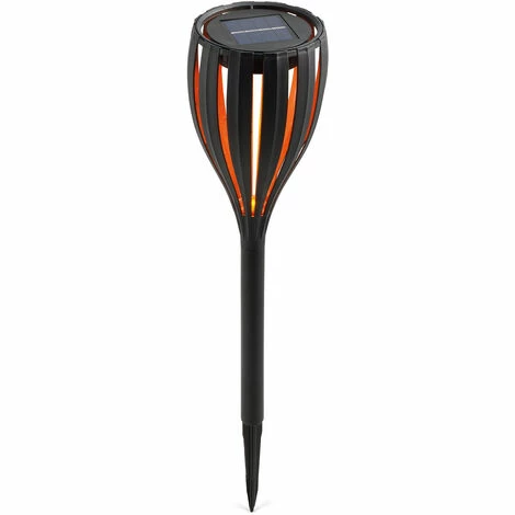 Die solarbetriebene Gartenfackel Malabo schafft durch ihr schlichtes, aber ungewöhnliches Design eine einzigartige Atmosphäre in Gärten, auf Terrassen und Balkonen: Aus einem schmalen Erdspieß entwickelt sich der Kopf der Fackel, der sich nach oben hin kreisrund erweitert. Dabei besteht der Fackelkopf aus schmalen Streben, die in gleichmäßigen Abständen nebeneinander aufgereiht sind. Das bernsteinfarbene Licht der LED im Fackelkopf wird durch die so entstandenen schmalen Schlitze hinausgeleitet und beleuchtet seine Umgebung mit einem warmen Schein.