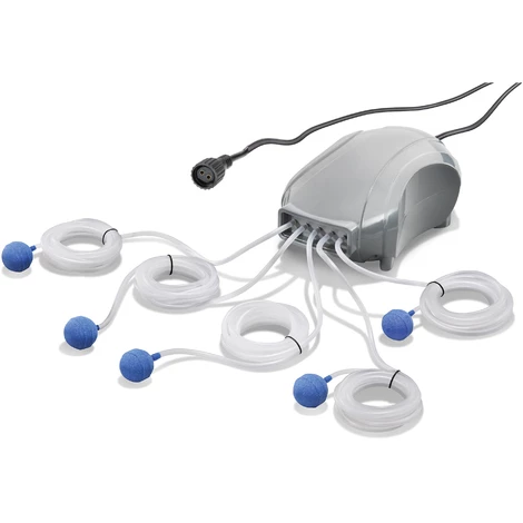 Die Lieferung erfolgt einsatzfertig mit Solarmodul, Teichbelüfter mit 5 x 3 m Schläuche und 5 Sprudelsteinen.